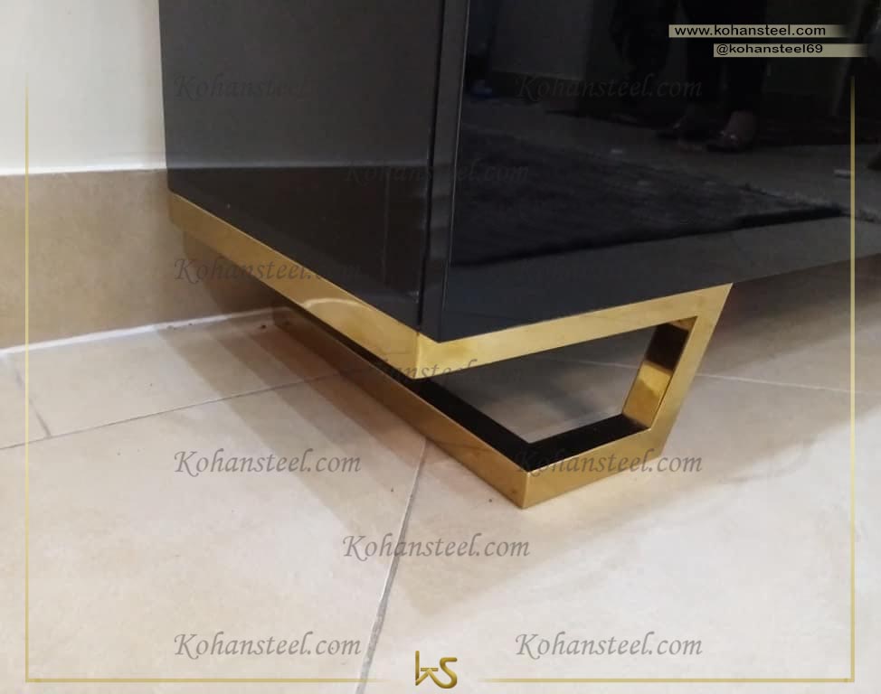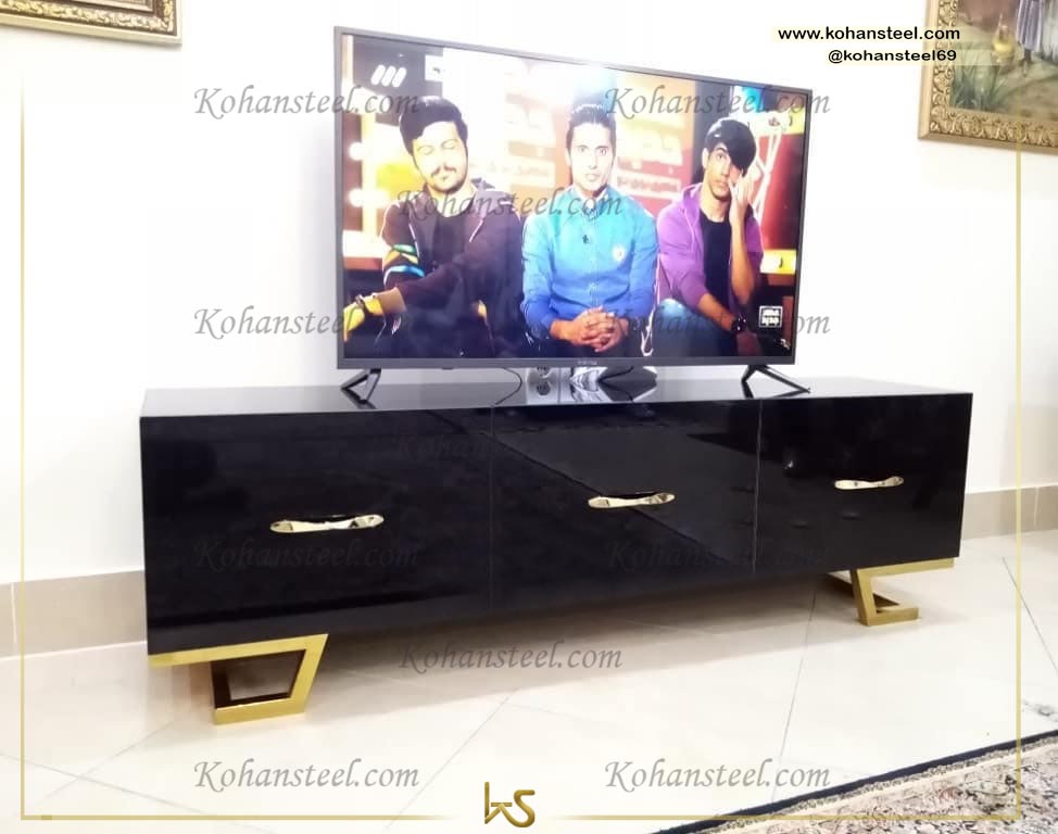 این میز تی وی با استفاده از ام دی اف هایگلاس مشکی و پایه استیل طلایی ساخته شده.میتوان ماین میز تی وی پایه استیل را با انواع ام دی اف موجود در بازار تولید کرد.